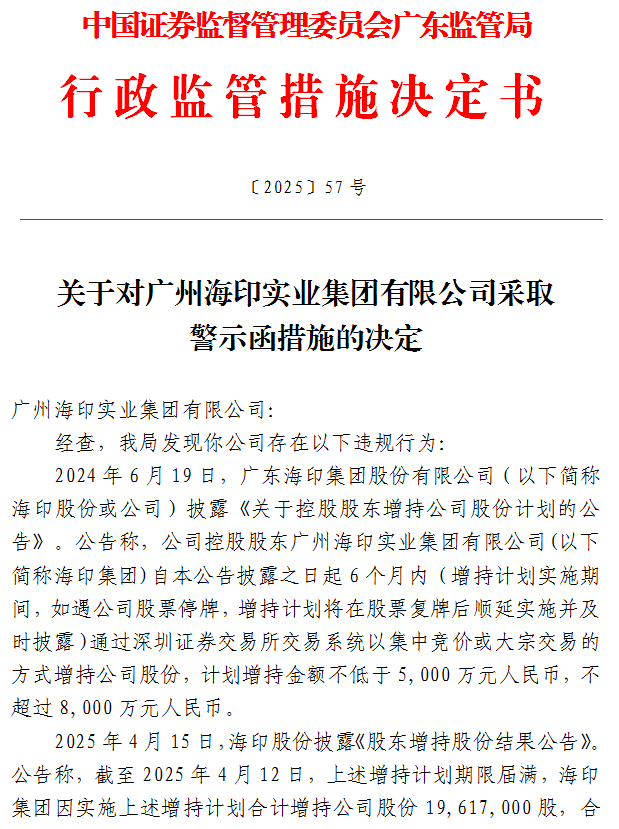 5月19日,因未履行增持承诺,海印股份控股股东,广州海印实业集团有限公司(以下简称海印集团)被采取警示函措施。广东证监局官网披露文件显示,2024年6月19日...